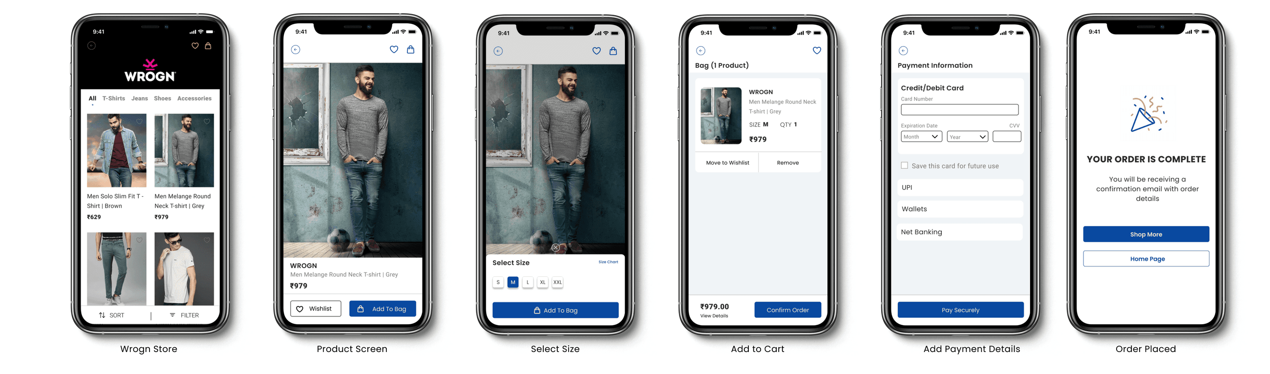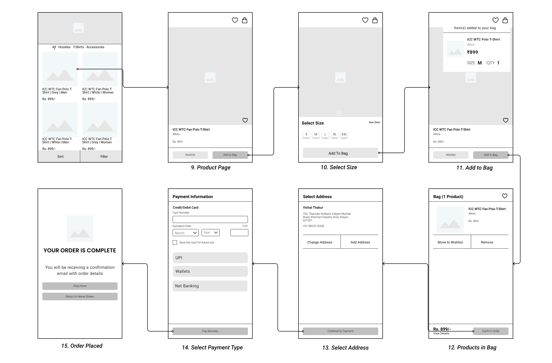The wireframes focus on the core user flow - home, search, product discovery, and checkout—to validate structure and navigation before moving to visual design.