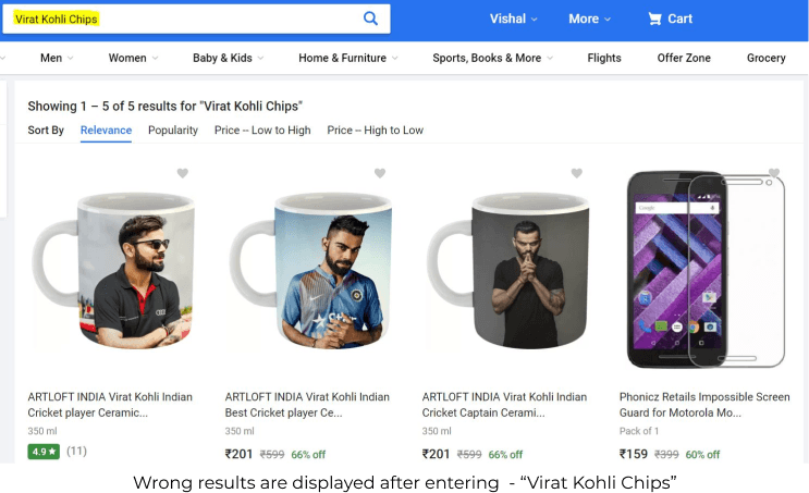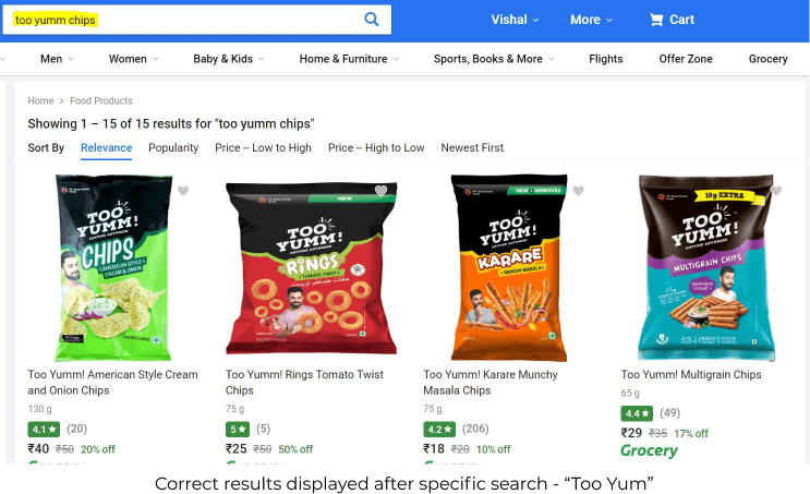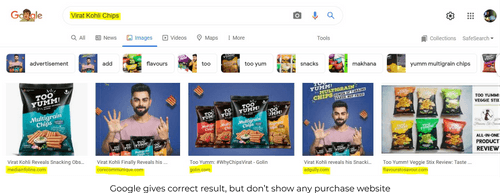 Even though Flipkart has the product(Too Yumm Chips - Virat Kohli Chips Brand) listed on their website, searching with "Virat Kohli Chips" gives a completely different result. We have to search specifically for the Brand Name - "Too Yumm Chips".