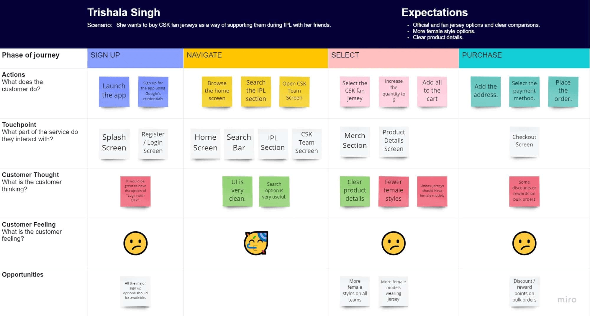 Based on interview insights, I mapped user expectations and created a user journey to identify key pain points and opportunities across discovery, selection, and purchase.